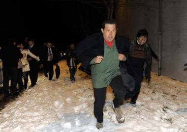 This is a picture of Hugo Chavez in Copenhagen last night. It remains unclear whether he was running away from the smell of sulfur after Obama spoke at the conference or if he is running away from one of those flying Dutchmen that wants to invade Venezuela.