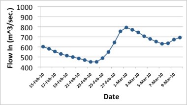as you can see, the flow almost doubled after February 25th. as the rain brought in more water for a few days, going from around 400 cubic meters per sec. to 800. Then the flow dropped again to around 600 m^3/sec. and on March 8th. it rained again and water inflows levels are around 700 m^3/sec.