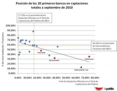 shows how stingy Government banks are at lending. You can see in the y-axis, the percentage of intermediation (loans to deposits) of the top twenty banks in the system and in the x-axis the percentage of official, Government deposits.