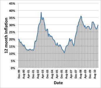 We were told by Minister of Planning and Finance Giordani, who has been in this Government over ten of the last twelve years, that Venezuela’s inflation problem was “structural” and in the never changing strategy of blaming the “previous” Government for everything, he accused the IVth. Republic of this problem. I guess twelve years is not enough in his mind to solve this problem, ignoring the fact that in those twelve years, the most insidious influence on inflation, that of the world, almost magically vanished, with most countries not only having single digit CPI’s, but many in the low single digits.
