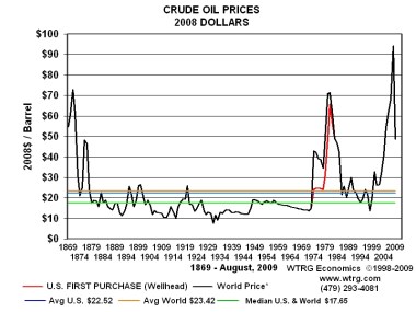 taken from apparently a book by him. I find this plot fascinating. It shows Venezuela’s per capita GDP since 1830 in constant Bolivars, that is adjusted for inflation. What is remarkable is how little GDP per capita has increased since essentially the 50’s. Since Venezuela went from producing zero oil in 1914 to producing half a million barrels of oil in 1950, the rise until 1950 can easily be understood. The rest, as they say, is pure Devils Excrement, production went up to one million barrels a day by 1960, without GDP per capita increasing significantly. Then, as seen below, the price of oil began to rise in 1969 (see chart below), production more than tripled and GDP per capita barely moved up. You can see how the peaks and valleys in price are clearly reflected in the GDP plot, but it never got above the level set in the 70’s, despite the fact that the price zoomed up.