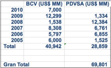It’s interesting to note that the total givenĀ by Giordani is roughly what was contributed by the Venezuelan Central Bank, under the screwed up concept of excess reserves, and PDVSA, whose contributions are now set by law, as shown in the Table below, where I have used all public sources from the BCV, Fonden and PDVSA to come up with the grand total of US$ 69.80 billion contributed to Fonden.